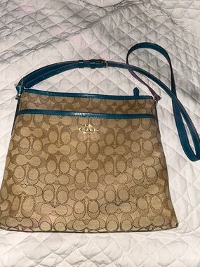 Coach signature monogram crossbody with teal leather trim and adjustable strap. Zip-top closure and front slip pocket for easy access. Lightweight design for everyday wear.