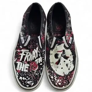 Serve bold horrorcore / alt streetwear vibes with these Vans Friday the 13th slip-ons. Featuring Jason Voorhees mask graphics, blood splatter design, and “Friday the 13th” text, these are statement sneakers for collectors, horror fans, or anyone building an edgy fit.
