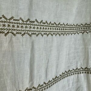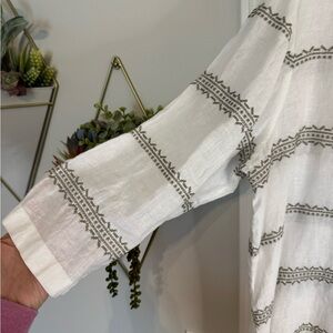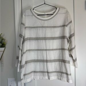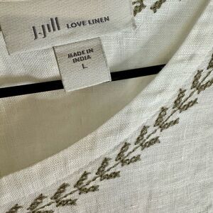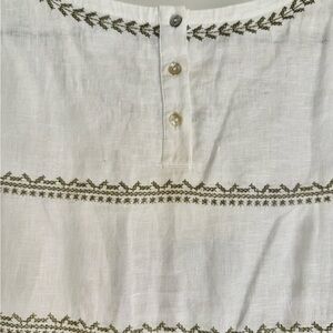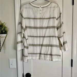 L, White with khaki embroidery, 3 buttons at back, 3/4 sleeves, EUC! Linen & Cotton