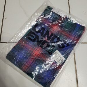 Stylish plaid scarf by Lands' End. Features a blend of blue, red, and green tones.