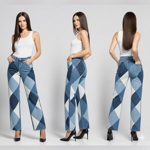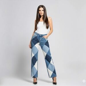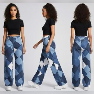 Turn your outfit into a statement with the Diamond Patchwork Jesns – Statement Edition, a bold and fashion-forward piece that blends street style with modern art. These high-waisted wide-leg jeans feature a striking geometric patchwork design in shades of light blue, indigo, and crisp white. The structured silhouette visually elongates the legs, while the wide-leg cut offers movement and ease — perfect for a confident, stylish look.