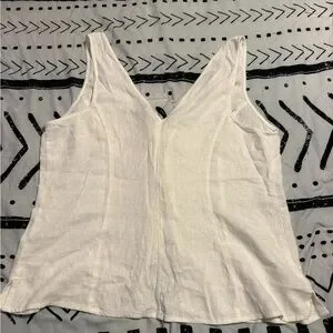 Sleeveless linen tank with V-neck. Front tie closures for adjustable fit. Lightweight and breathable for warm days. Simple, versatile design that pairs easily with shorts or skirts.