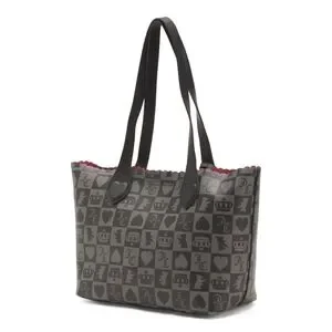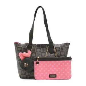 Juicy Couture tote in black with signature pattern. Includes removable pink heart-print pouch. Gold-tone chain and heart charms add shine. Top straps for shoulder carry. Cute and functional for daily use.