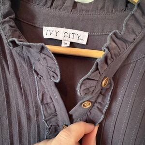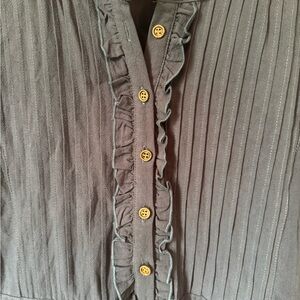 Blue tiered midi dress with embroidered pink star panels. Pin-tuck bodice with button-front and tie waist. Short sleeves with embroidered stars. Flowy skirt WITH POCKETS. Only worn once, like new condition.