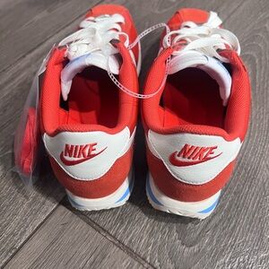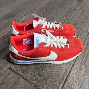 Bold red upper with white laces and accents. Lightweight sporty silhouette. Comfortable low-top profile for everyday wear.