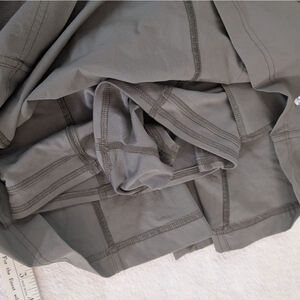 Features: Durable, water-resistant nylon fabrication; breathable, four-way stretch built-in shorts; built-in shelf bra; adjustable straps; front pockets; shorty length; scoop-neck