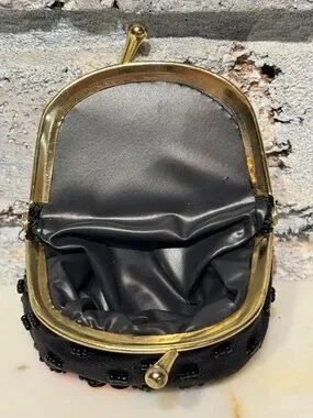 Keep your Pennie’s in this stylish vintage mini coin purse with colorful sequins. Features black fabric base with green, red and pink sequin accents. Gold-toned frame clasp for secure closure. Compact and eye-catching. A miniature statement piece. Plastic interior for easy cleaning. Mouse shown for size and is not included.