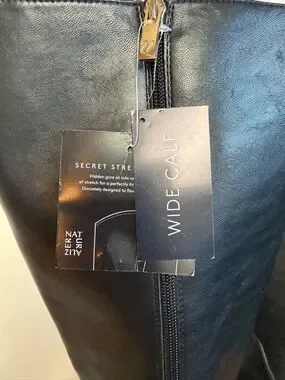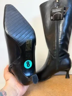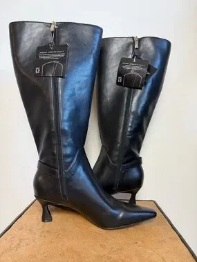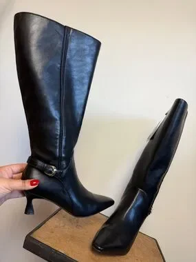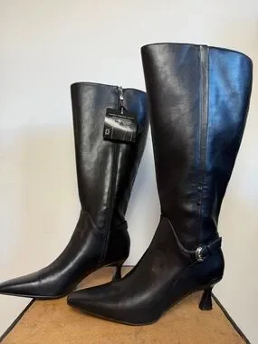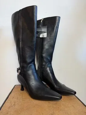 Pointed-toe knee-high boots by Naturalizer. Smooth black leather upper with side zipper. Mid sculpted heels for polished wear. Streamlined silhouette works with skirts or pants.