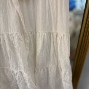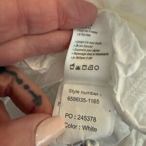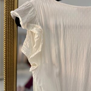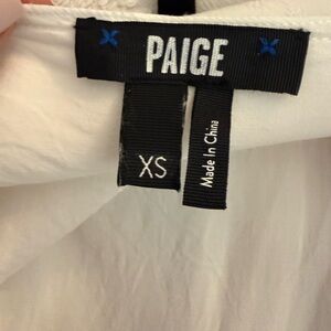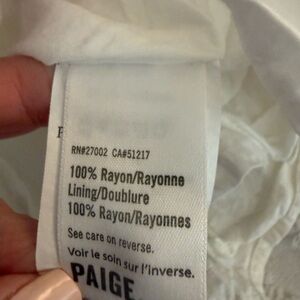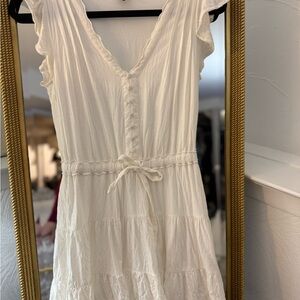Lightweight white mini dress by PAIGE. Flutter cap sleeves and V-neckline. Smocked waist with tie for shape. Soft tiered skirt for movement. Elegant, airy look for daytime wear.