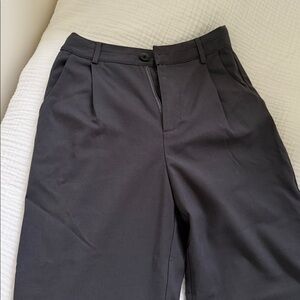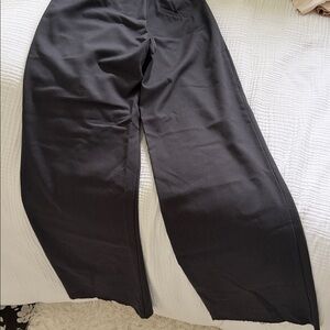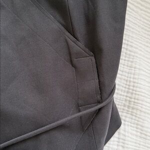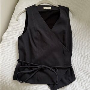 Chic two-piece set with a wrap-style vest and matching tailored trousers. Tie waist on the vest for adjustable fit. Straight-leg pants with clean lines. Minimal, modern silhouette suitable for work or events.