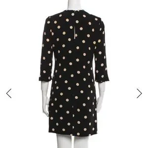 Playful polka dot mini dress by kate spade. Round neckline with subtle ruffle. Three-quarter sleeves. Straight, easy silhouette for effortless style. Size 4. Size small.