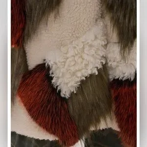 Stylish women's patchwork faux fur coat in cream, olive and rust tones. Soft faux shearling panels with longpile faux fur accents create rich texture. Cozy shawl collar and cuff detailing add luxe appeal. Versatile statement piece that elevates cold-weather outfits.