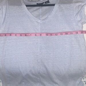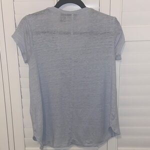 Casual light blue, V-neck, 100% Linen, short sleeve tee by Tahari. Lightweight slub knit for easy wear. Relaxed silhouette with slight high-low hem. Simple, versatile design for everyday outfits. Very light, small stain on back right shoulder blade area (See pic).