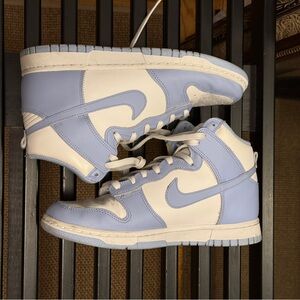 High-top Nike Dunks with leather upper. Pastel blue overlays and white panels. Perforated toe and lace-up front. Cushioned collar and rubber sole.