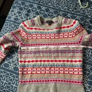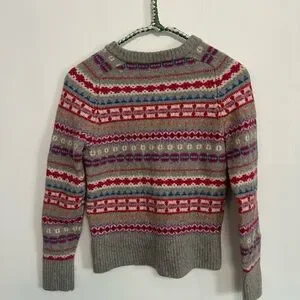 Fair Isle patterned wool sweater. Heather gray base with multicolor stripes. Crew neckline and ribbed hem. Soft textured knit. Bright seasonal palette.
