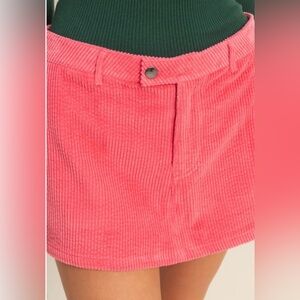 Chic pink corduroy mini skort with a flattering A-line silhouette. Soft textured fabric for comfortable all-day wear. Stylish front button and hidden zip closure for a clean finish. Versatile piece that pairs well with knit tops and casual layers.
