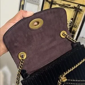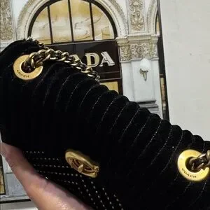 Luxurious black velvet body with quilted channels. Gold-tone turnlock closure and stud accents. Braided gold-and-black chain strap. Elegant and versatile design for day or night.