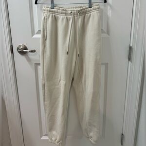 Comfortable cream jogger pants with an elastic drawstring waist. Soft, breathable fabric for all-day wear. Tapered leg with cuffed hem for a modern fit. Versatile casual essential in cream.