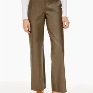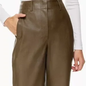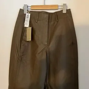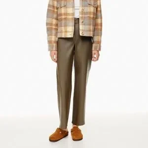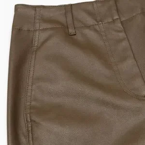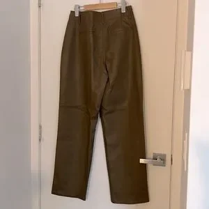 High-waist straight-leg design. Smooth leather-look finish. Side pockets and belt loops. Clean, minimalist styling.