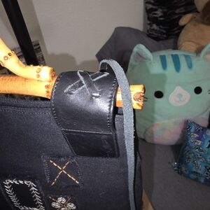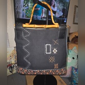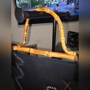 Unique Black Bamboo-Handle Embroidered Medium Tote Bag - Preloved Condition
