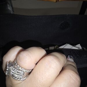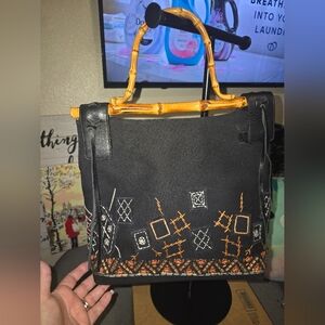 Stylish black tote with bamboo-style handle. Features decorative orange and white embroidery for a unique look and 3 separate velcro openers. Lightweight and easy to carry for everyday use. Versatile design pairs well with casual outfits.