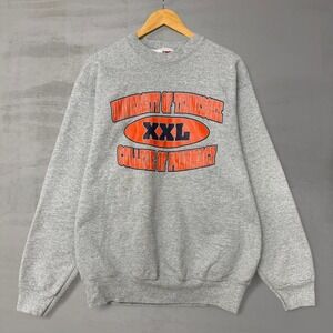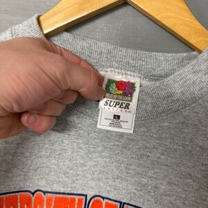 Vintage Fruit of the Loom Super Cotton sweatshirt from the University of Tennessee College of Pharmacy. This crewneck features a bold orange and navy graphic print on a classic heather gray base. Constructed from a heavy 80/20 cotton polyester blend, it offers a sturdy, high-quality feel typical of 90s made in USA apparel. Finished with ribbed cuffs and waistband for a secure fit.