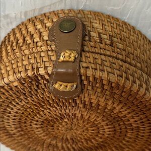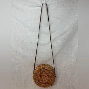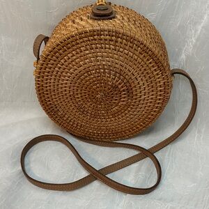 Stylish woven round straw crossbody bag in brown. Lightweight design with leather trim and adjustable leather strap for easy wear. Secure top closure and compact interior for daily essentials. Versatile color pairs well with casual and summer outfits. Floral lining.