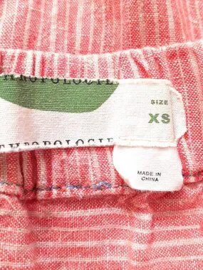 Very good pre-owned condition. Anthropologie Linen Striped Ankle Pants. Size: XS. 100% linen. Color: orange stripe. Machine wash. Pull on style with elastic waist, two front pockets and two back pockets. Contrasting stripe section down the side of each leg.