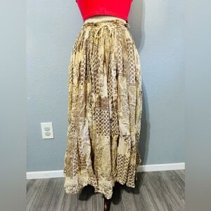Short Circuit cotton maxi skirt features a beautiful patchwork-style print with intricate floral and geometric patterns in earthy tones. Crafted in India from lightweight, breathable cotton, it offers a voluminous, flowy silhouette perfect for warm-weather styling. The elasticized drawstring waistband is accented with delicate beaded tassels, providing a comfortable and adjustable fit. This versatile piece captures a free-spirited aesthetic, easily transitioning from casual daytime outings to evening gatherings.