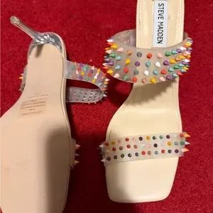 Steve Madden slide heels with nude footbed and clear straps. Clear stiletto heel. Straps adorned with multicolored spike studs. Playful, fashion-forward accent for outfits.
