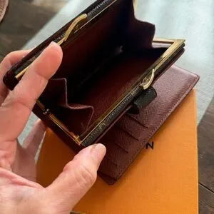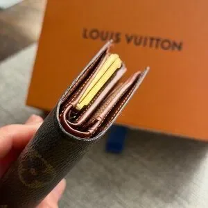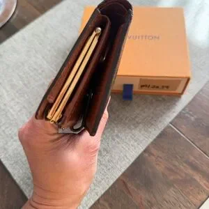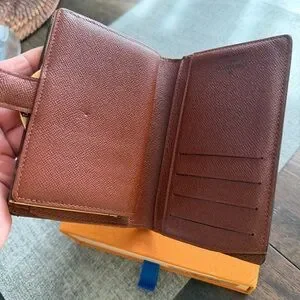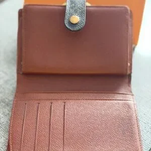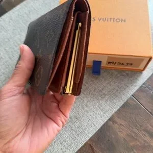Iconic Louis Vuitton monogram canvas card holder. Snap closure with signature brass-tone button. Multiple card slots and a compact wallet layout. Timeless luxury accessory for daily use.