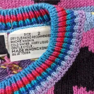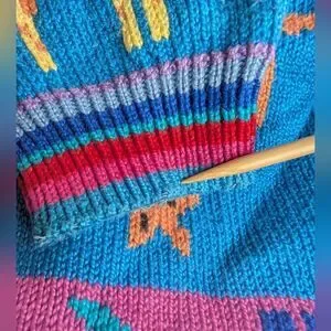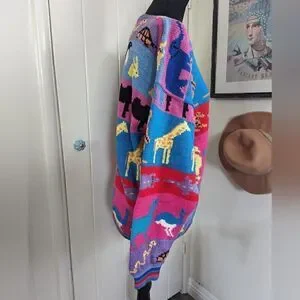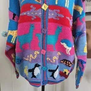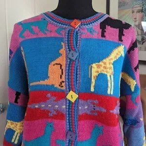 Description: Christine Foley Novelty Print Noah’s Ark Knit Cardigan Sweater sz 2 (8, 10, 12) EUC, standout style with 7 colored diamond shaped wood buttons, medium weight to fabric, whimsical design of animals and colors throughout, sz 2 but it can fit anywhere from size 8-12 so please check the flat lay measurements below