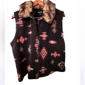 Vintage True Grit Southwestern Aztec Tapestry Vest Faux Fur Collar Sz L Women