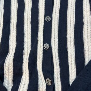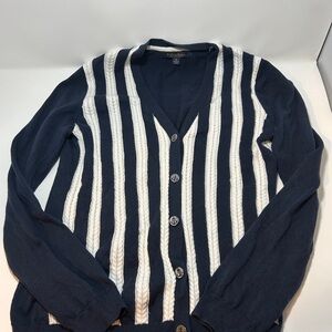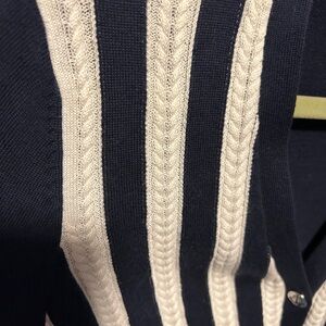 Brooks Brothers cardigan with vertical white cable stripes. V-neck button front design. Lightweight knit for layering. Timeless navy and white colorway.