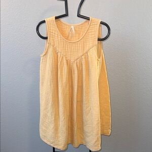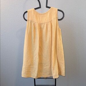Light yellow sleeveless tank dress in soft cotton gauze. Flowy A-line silhouette with gentle gathers for a relaxed, breathable fit. Lightweight and comfortable for warm-weather wear. Easy to style for casual everyday looks.