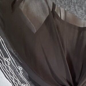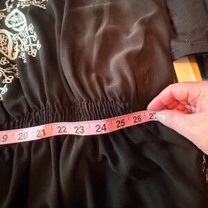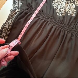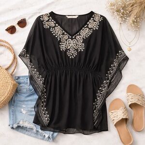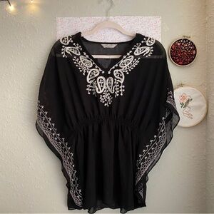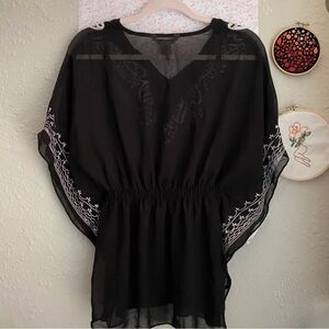 Beautiful black boho-style tunic top with intricate white embroidery and an easy, flowy silhouette. Features a flattering elastic waist, wide kimono-style sleeves, and lightweight sheer fabric—perfect for layering over a tank, bralette, or swimsuit.