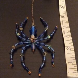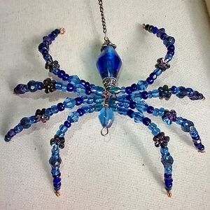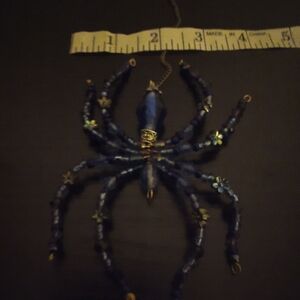 Handmade beaded spider pendant. Features faceted and round blue beads with floral spacer accents. Metallic findings and hanging loop for display. Bright blue and aqua hues add sparkle. Larger sized artisan sculptural art that's a one-of-a-kind statement piece.