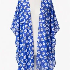 Blue daisy print kimono with a relaxed, flowy fit. Lightweight and easy to throw on over swimsuits or casual looks. One size fits most.