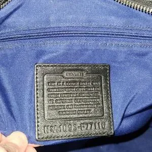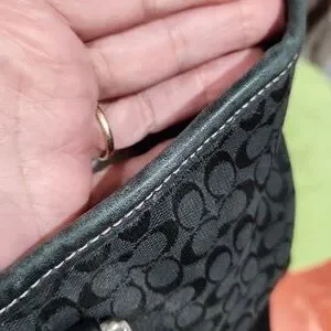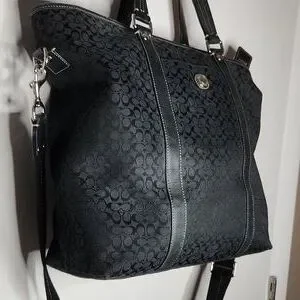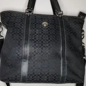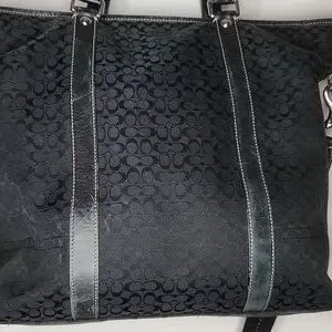 Coach black signature canvas tote with leather trim. Stylish and practical design for everyday use. Features the Coach logo accent and dual shoulder straps. Sleek black finish pairs easily with any outfit.