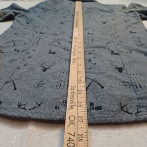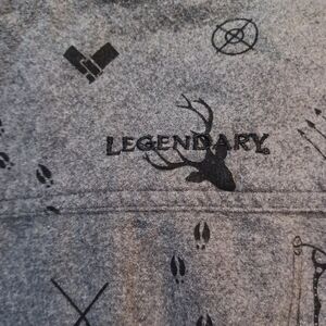 Casual button-down shirt by Legendary Whitetails. Grey fabric with all-over black outdoor and hunting icons. Long sleeves with buttoned cuffs. Subtle chest pockets for style and function.