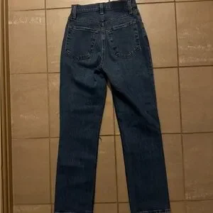 Dark blue denim straight leg jeans. High-rise waist with classic five-pocket styling. Clean, timeless look. Versatile piece for everyday wear. Size 23/000XS.