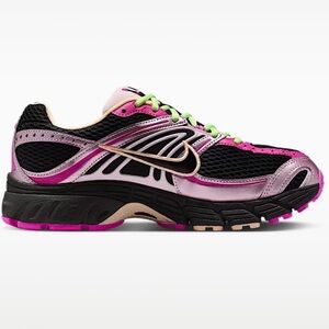 Nike athletic sneakers. Black mesh upper with bright pink and metallic purple overlays. Lime green laces and cream inner lining. Sporty design with layered details.