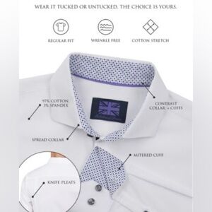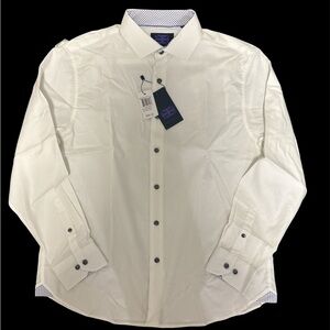 Classic white long-sleeve dress shirt with subtle contrast trim at the collar and cuffs. Tailored fit with button-front closure and polished dark buttons. Versatile piece for work or events. Available in white.