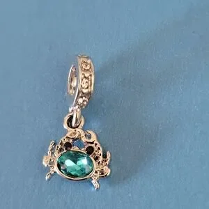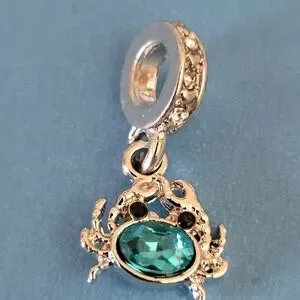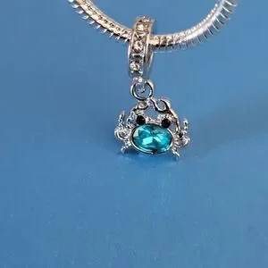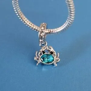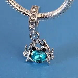 this is not the official Pandora brand! we are putting numerous Pandora Style individual charms up for sale at affordable prices! this gorgeous aqua blue and silver color metal beach crab dangle charm with rhinestones on the band is adorable and so nice! compatible with Pandora and other European style bracelets! this sale is for one charm only. it does not include the bracelet. thank you!