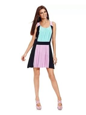 Betsey Johnson Pleated Sleeveless Navy Blue, Teal and Lilac Midi Dress