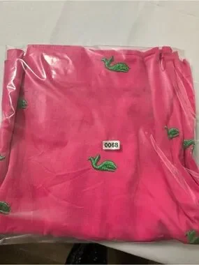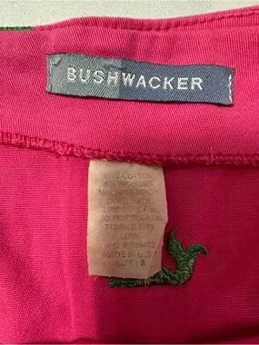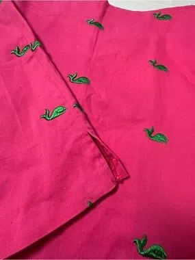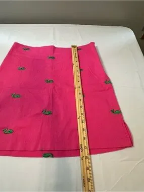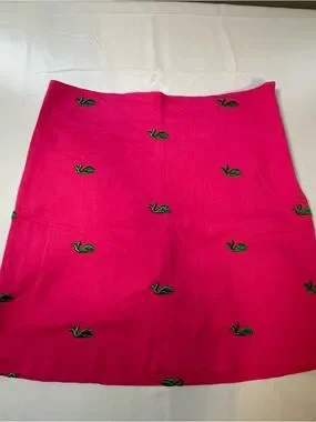 Bold hot pink mini skirt detailed with small green embroidered whale motifs. Lightweight and flattering cut for easy styling. Pair with neutral or contrasting tops for a fresh, playful look.