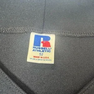 Russell Athletic jersey featuring bold brand logo at neckline. Black fabric with stitched label in blue and red. Simple sporty look for casual wear.