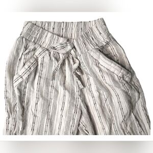 Stylish wide leg pants with a drawstring waist. Features a chic striped pattern. Ideal for casual or dressy looks.