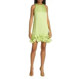 Sleek sleeveless mini dress with a high neckline. Smooth fabric falls straight to a dramatic ruffled hem. Bright lime color makes a bold statement. Flirty skirt detail adds movement.