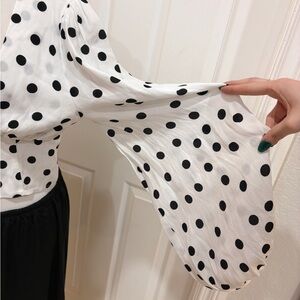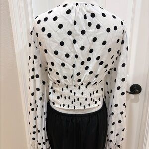 Chic white V-neck crop blouse with black polka dots. Lightweight, drapey fabric for comfortable all-day wear. Signature button-front detail and flattering fitted waist. Versatile piece that pairs easily with skirts or high-waist pants. Available in white with black dots.